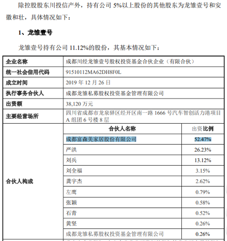 宏明电子股权结构显示,成都川经龙雏壹号股权投资基金合伙企业(有限合伙)(简称“龙雏壹号”)持股11.12%。龙雏壹号合伙人构成中,A股上市公司富森美出资比例为52.47%。以此推算,富森美间接持有宏明电子5.83%股份。